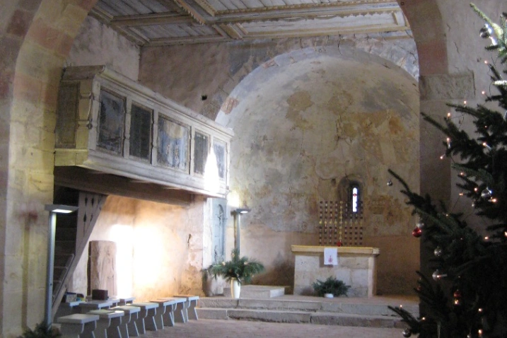 Einheitlich romanischer Bau mit Kirchenschiff, Chorraum und halbkreisförmiger Apsis.